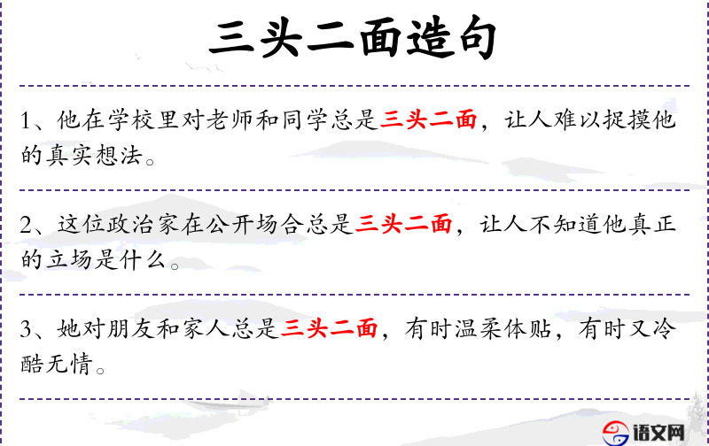 “三头二面”是一个成语,源自传统文化,形容人两面派,表里不一。这个成语的使用反映了人对人际关系和性格特点的观察和评价。