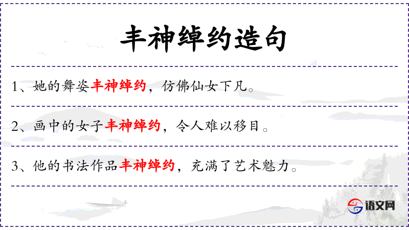 - 丰神绰约:形容诗文或艺术作品风格优美,富有神韵。