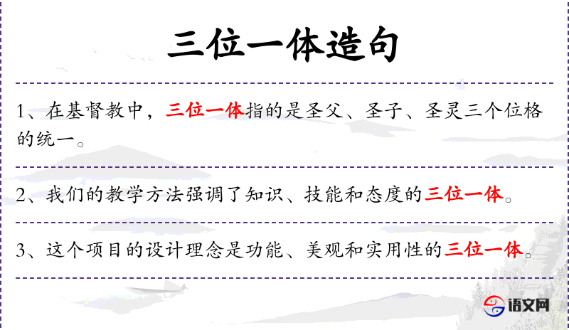 1. 【三位一体】 比喻三个人、三件事或三个方面联成的一个整体。