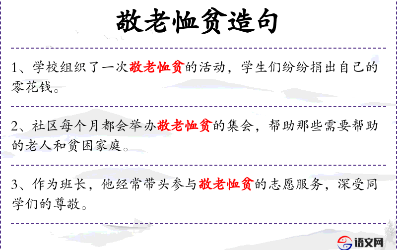 - 敬老恤贫:尊敬老人,怜悯贫困者。这是一个成语,强调对老年人和贫困者的尊重和关怀。