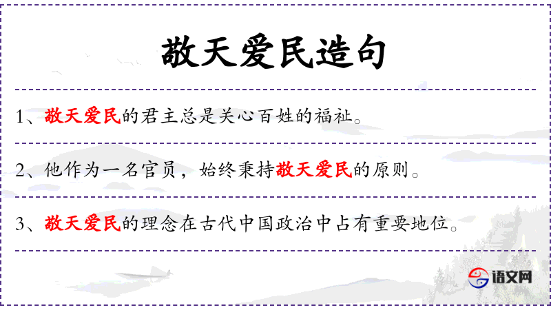 句子中的“敬天爱民”体现了传统文化中的政治伦理,强调政治人物应尊重天道和爱护人民。这种表达在文化中具有深厚的历史和文化背景。