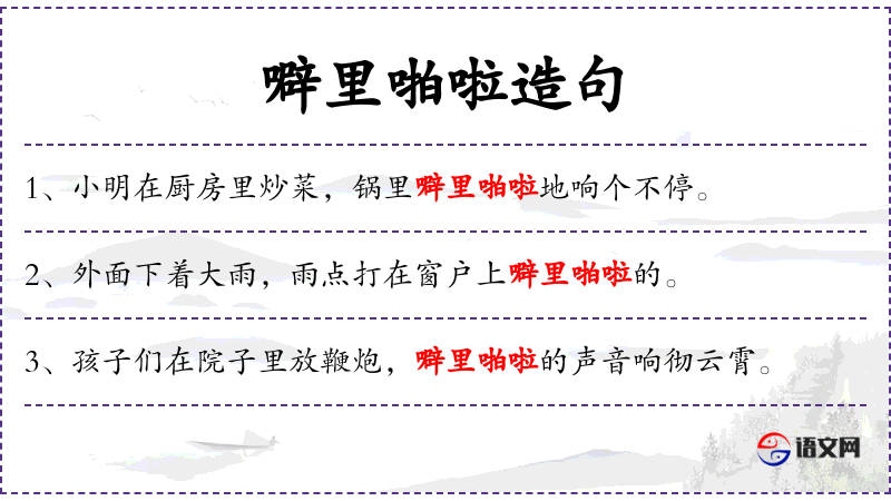 - 噼里啪啦:拟声词,形容木头裂开时的声音。