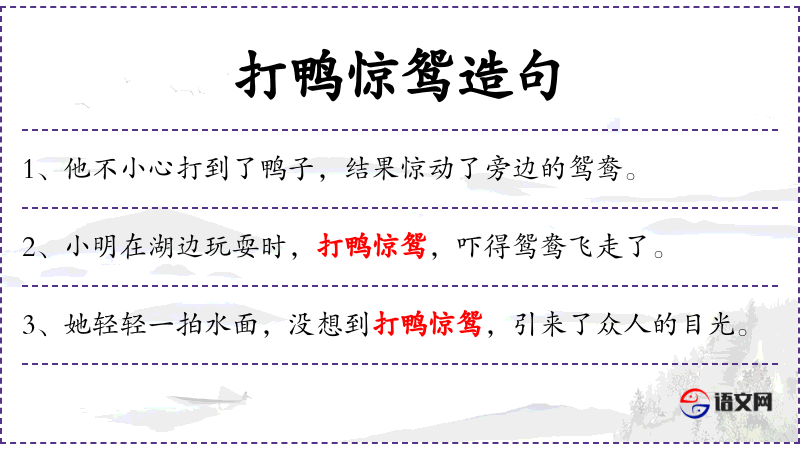 - 当小明在湖边玩耍时,他不小心打到了鸭子,结果鸳鸯被吓飞了。