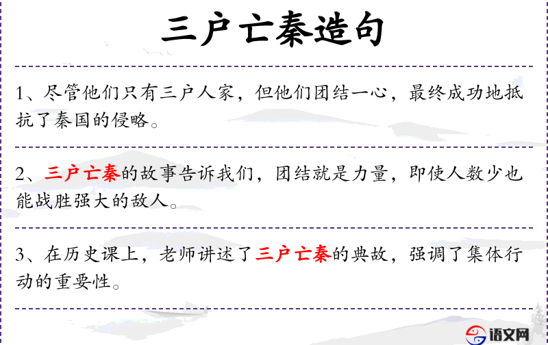 1. 【三户亡秦】 - 三户:几户人家;亡:灭。虽只几户人家,也能灭掉秦国。比喻正义而暂时弱小的力量,有消灭暴力的必胜信心。
