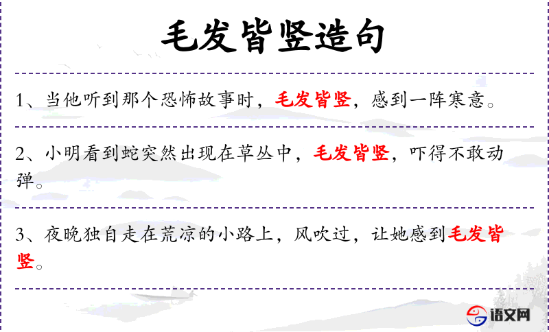 2. 【毛发皆竖】 - 竖:直立。汗毛和头发都竖立起来。形容极度恐惧、紧张的样子。