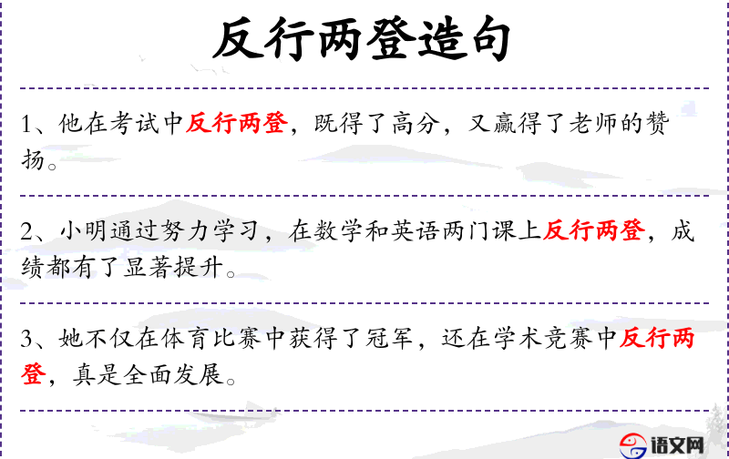 - 可以尝试用不同的句式表达相同的意思,例如:“他通过反行两登的方式,在公司中不仅提高了业绩,还赢得了同事的尊敬。”