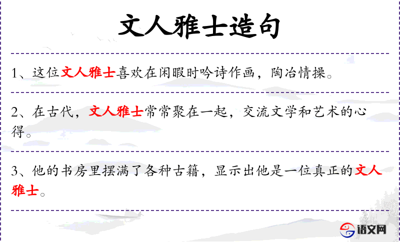 - 重点单词:Scholars(文人), gentlemen(雅士), often(常常), express(表达), emotions(情感), thoughts(思想), calligraphy(书法), painting(绘画)