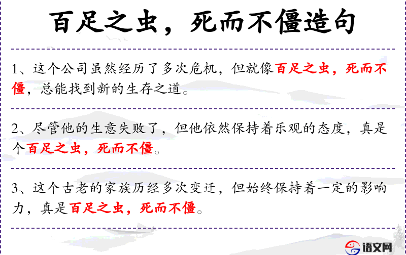 6. 【百足之虫】 百足:一种多节多足的爬虫,即马陆。比喻有实力基础的势力,虽一时败落,但不会很快彻底垮台。也指某一恶势力被摧垮后余孽尚存。