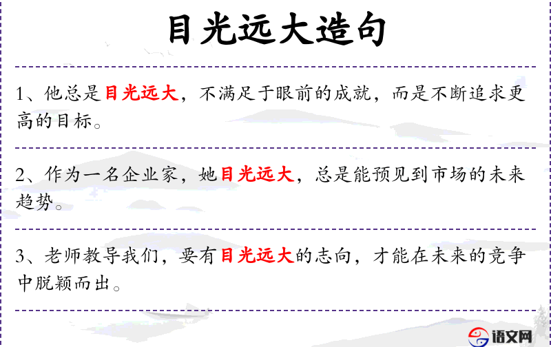 8. 【目光远大】 指一个人的见解及处世观高远而伟大。