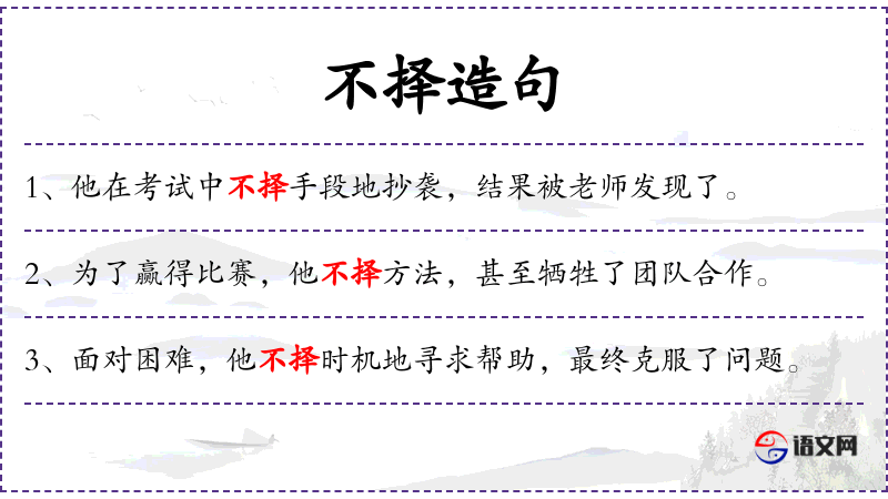 1. 【不择手段】 择:选择。指为了达到目的,什么手段都使得出来。