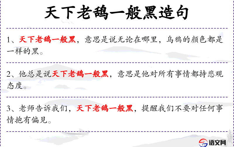 - 成语:“天下老鸹一般黑”是一个**成语,用来比喻事物或观点都一样,没有区别。