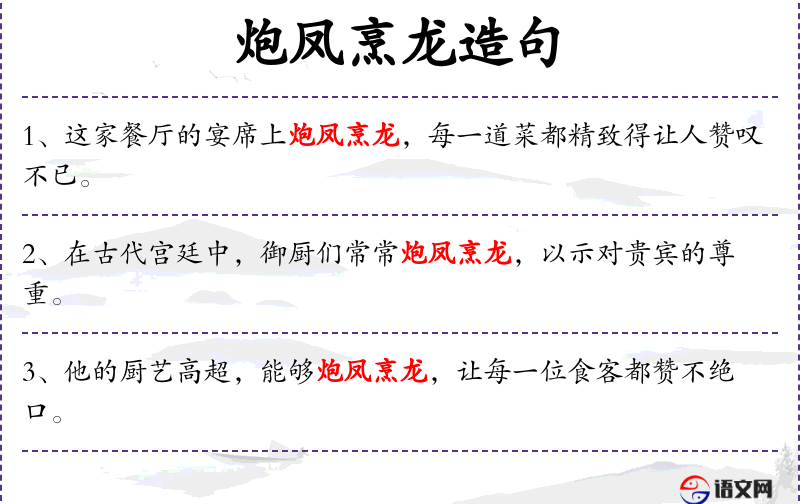 2. 【炮凤烹龙】 - 炮:烧;烹:煮。形容菜肴极为丰盛、珍奇。