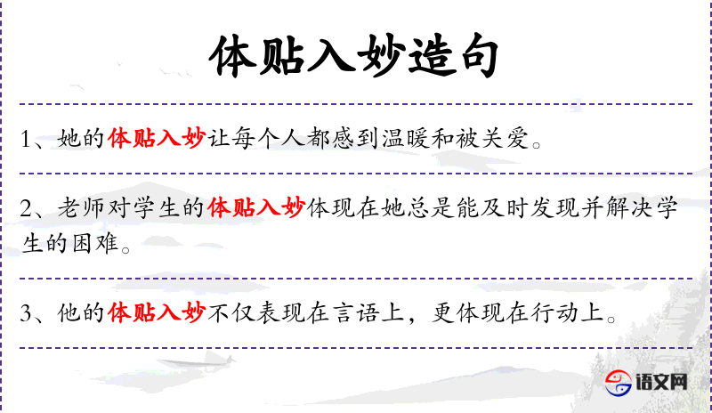 - 体贴入妙:这个词组形容一个人非常细心和周到,能够巧妙地照顾到他人的感受和需求。