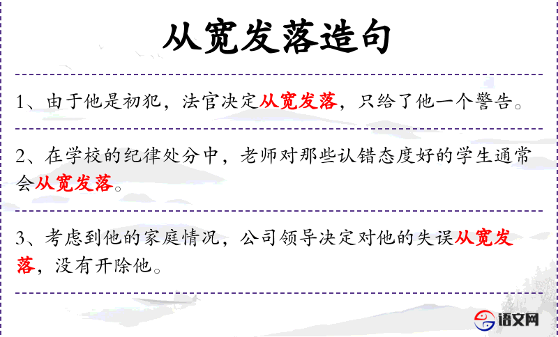 - 从宽发落:成语,表示在处理事情时采取宽松的态度或措施。