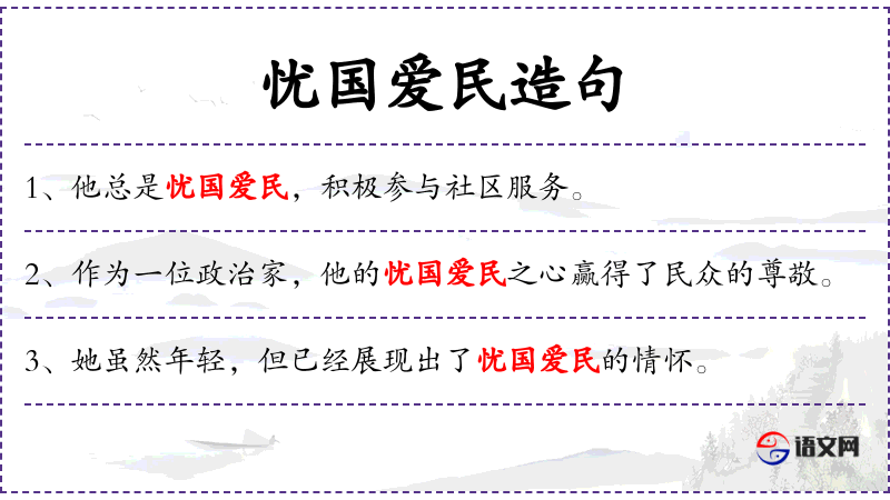 1. 【忧国爱民】 忧心国家,爱护百姓。