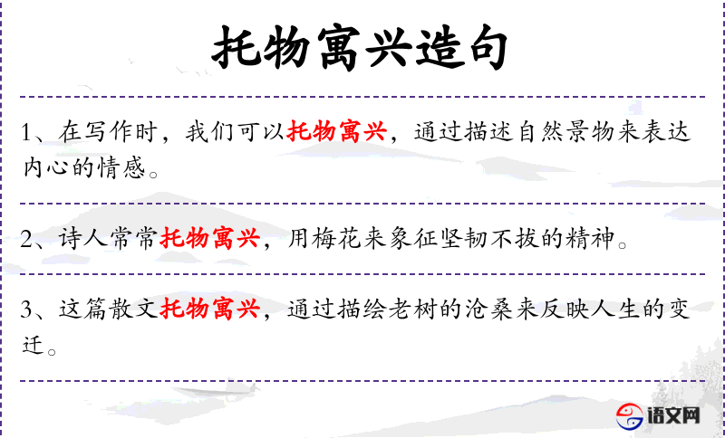 - 托物寓兴:通过描绘物体来寄托情感或寓意。