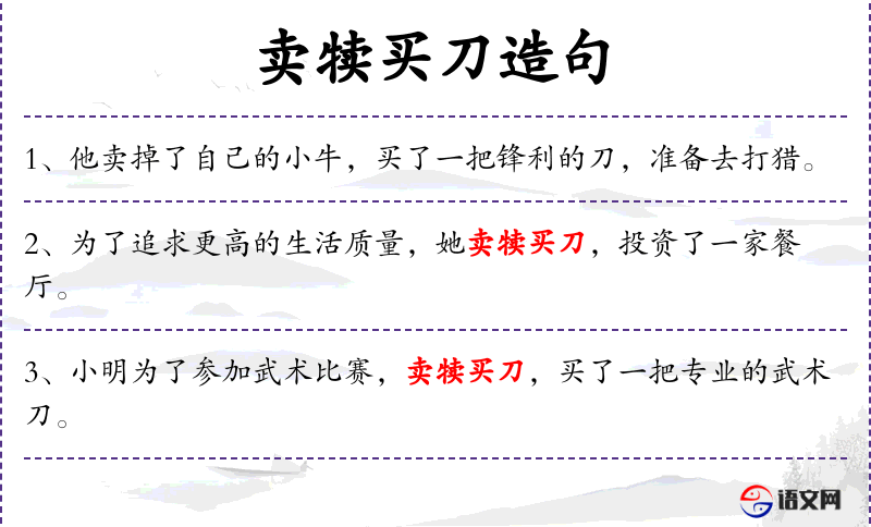 - 状语:为了参加马拉松比赛,卖犊买刀