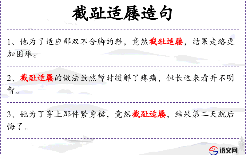 2. 【截趾适屦】 切断脚趾去适合鞋子的大小。比喻不合理的迁就。