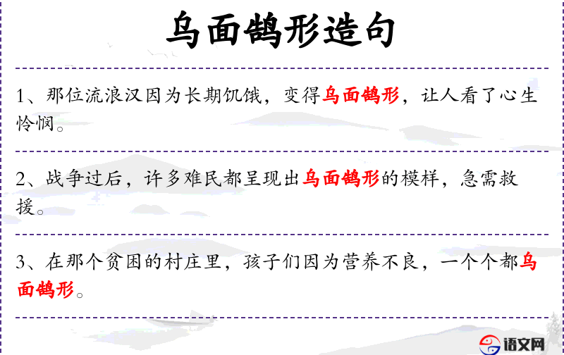 - 乌面鹄形:形容人因饥饿或疾病而面色苍白、憔悴。