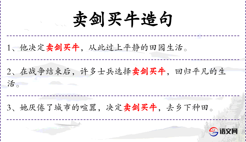 - 宾语:卖剑买牛,回归平凡的生活