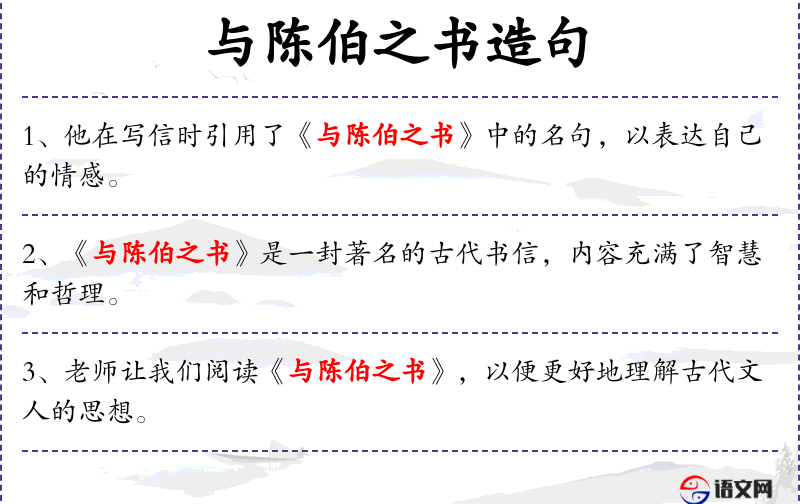 1. 【与陈伯之书】 - 骈文篇名。南朝梁丘迟作。陈伯之是投降北魏的梁将,梁军北伐时,作者替梁军主帅写信招降陈伯之。信中陈说归降与否的利害关系,宣扬梁朝的宽宏,最后用暮春三月,江南草长,杂花生树,群莺乱飞”的故国景物打动对方,尤为后人传诵。陈接信后,即率部复归梁朝。