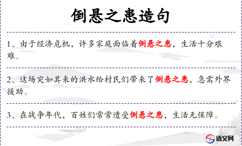 1. 【倒悬之患】 倒悬:头向下、脚向上悬挂着。比喻极其艰难、危险的困境。