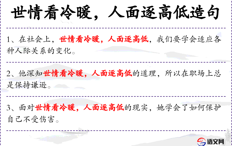 - 状语:面对世情看冷暖,人面逐高低的挑战