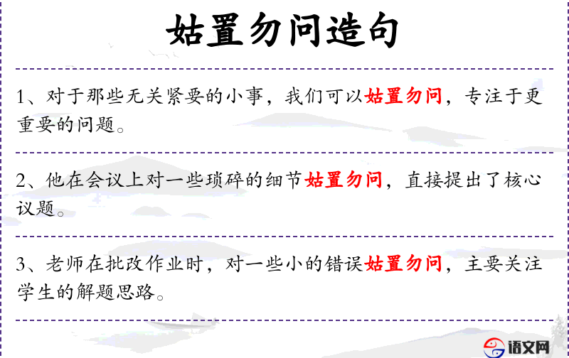 1. 【姑置勿问】 权且放过,不去追究责问。指对有过错的人暂时给予宽容。