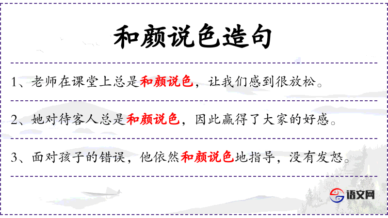 - 和颜说色:形容说话态度温和,表情和善。