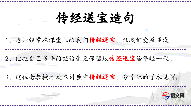 - 传经送宝:成语,比喻传授宝贵的知识和经验。