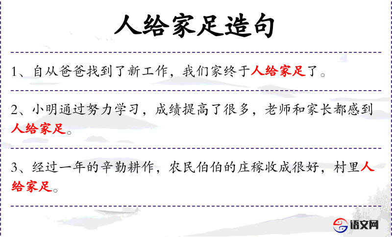 - 文化意义:“人给家足”这个成语反映了**传统文化中对家庭幸福和富裕的重视。