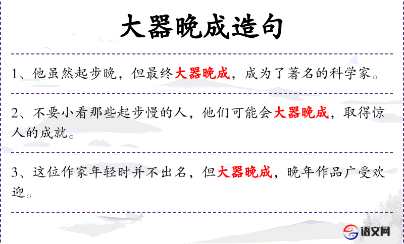 - 大器晚成:指有才能的人通常在较晚的年龄才取得成功。