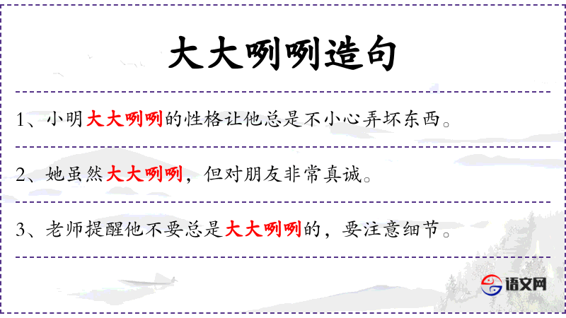 • 大大咧咧:形容词,形容一个人不拘小节、随和、开朗。