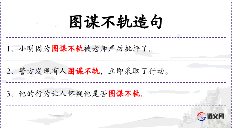 1. 【图谋不轨】 不轨:越出常轨,不守法度。谋划越出常规、法度之事。