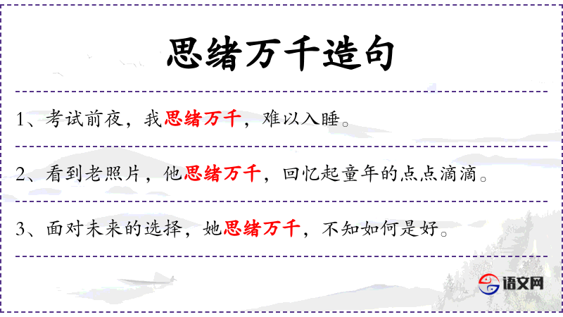 - 宾语:无明确宾语,但“思绪万千”可以视为谓语的补充说明。