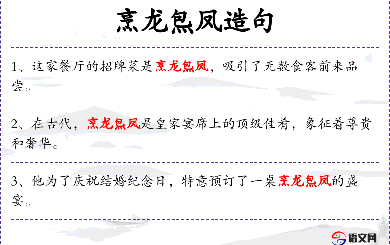 4. 【烹龙炰凤】 - 烹:煮。形容菜肴极为丰盛、珍奇。比喻作家的艺术技巧高明。