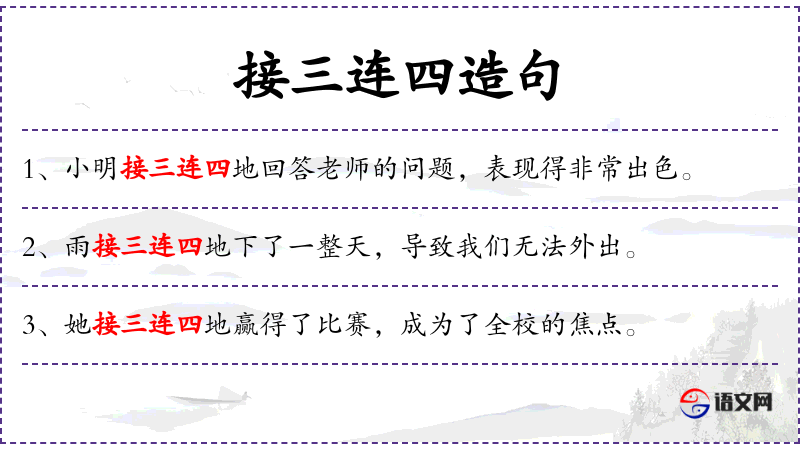 - 接三连四地:连续不断地、一个接一个地