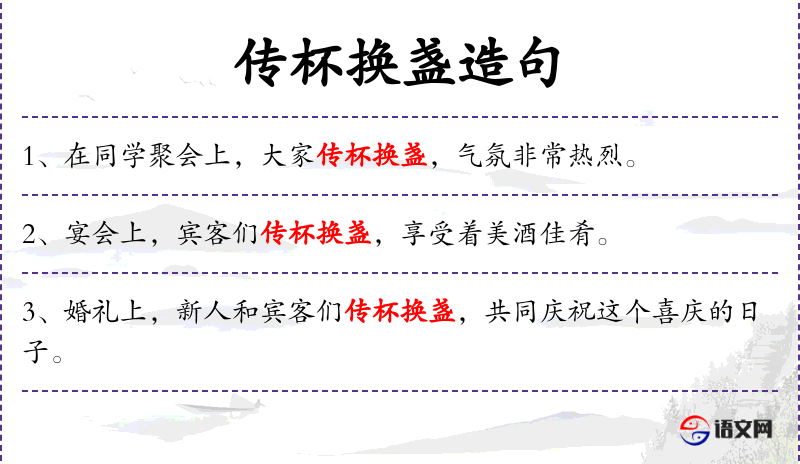 - 传杯换盏:形容宴会中人们互相敬酒的热闹场面。