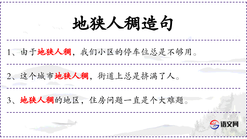 1. 【地狭人稠】 稠:密、多。土地狭窄,人口稠密。即地少人多,非常拥挤。