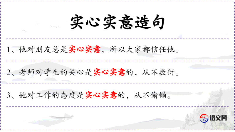 - 实心实意:形容词短语,表示真诚、不虚假。