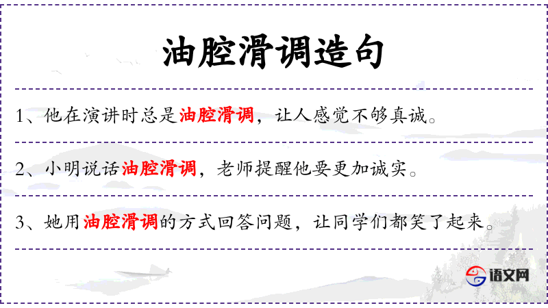 4. 【油腔滑调】 形容说话轻浮油滑,不诚恳,不严肃。