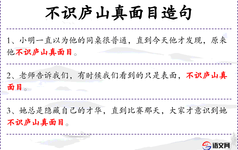 - 不识庐山真面目:成语,表示不了解事物的本质或真相。