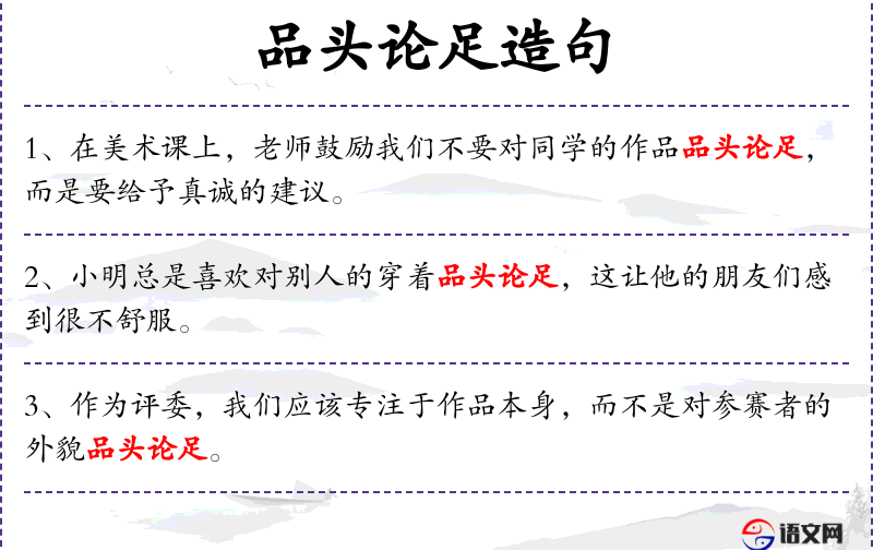 句子:“在学校的辩论赛中,选手们应该专注于论点,而不是对对方的言辞品头论足。”