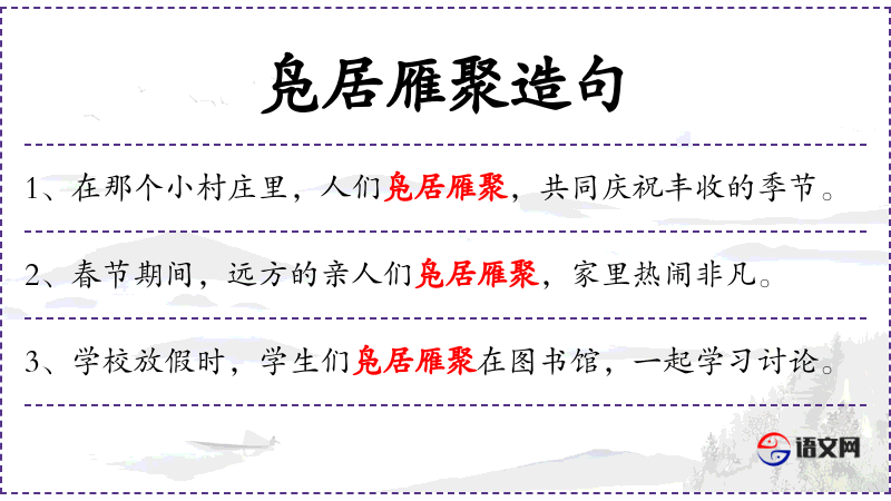 - 成语:“凫居雁聚”比喻人们聚集在一起,形象地描述了学生们聚集在图书馆的情景。