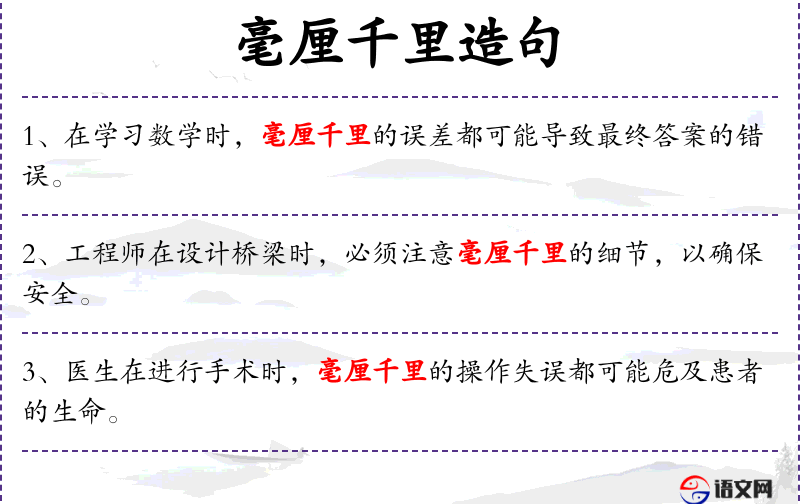 6. 【毫厘千里】 毫、厘:两种极小的长度单位。开始时虽然相差很微小,结果会造成很大的错误。