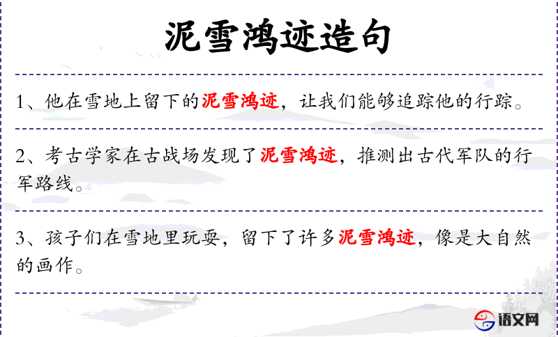 4. 【泥雪鸿迹】 - 大雁在雪泥上踏过留下的爪印。比喻往事遗留的痕迹。