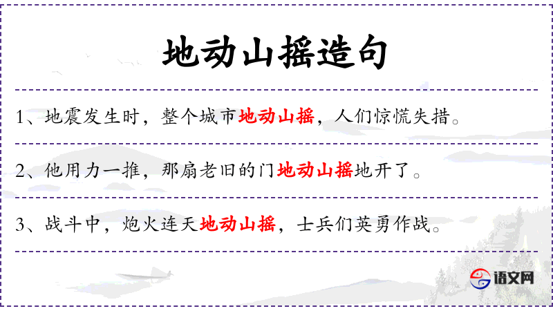 - 成语“地动山摇”在**文化中常用来形容极大的震动或变动。