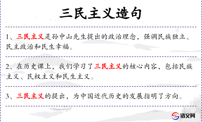 1. 【三民主义】 孙中山在他所领导的中国资产阶级民主革命中提出的政治纲领,即民族主义、民权主义和民生主义。在十月革命的影响和中国共产党的帮助下,孙中山制定了联俄、联共、扶助农工三大政策,并于1924年重新解释了三民主义。民族主义是反对帝国主义,主张国内各民族一律平等;民权主义是建立为一般平民所共有、非少数人所得而私的民主政治;民生主义是平均地权,节制资本。