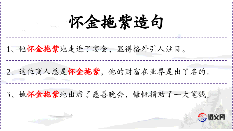 - 怀金拖紫:这个成语源自**古代,形容官员或贵族的服饰,象征着地位和财富。
