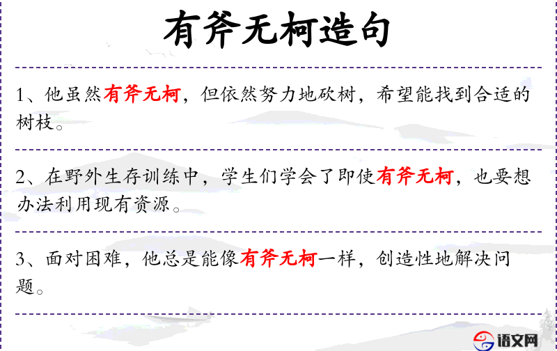 1. 【有斧无柯】 - 柯:木制的柄。有斧子头却没有斧柄。比喻有卓越的才能,却没有借以施展的条件。